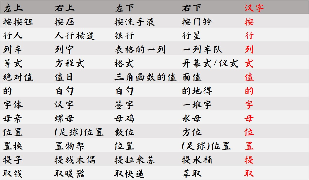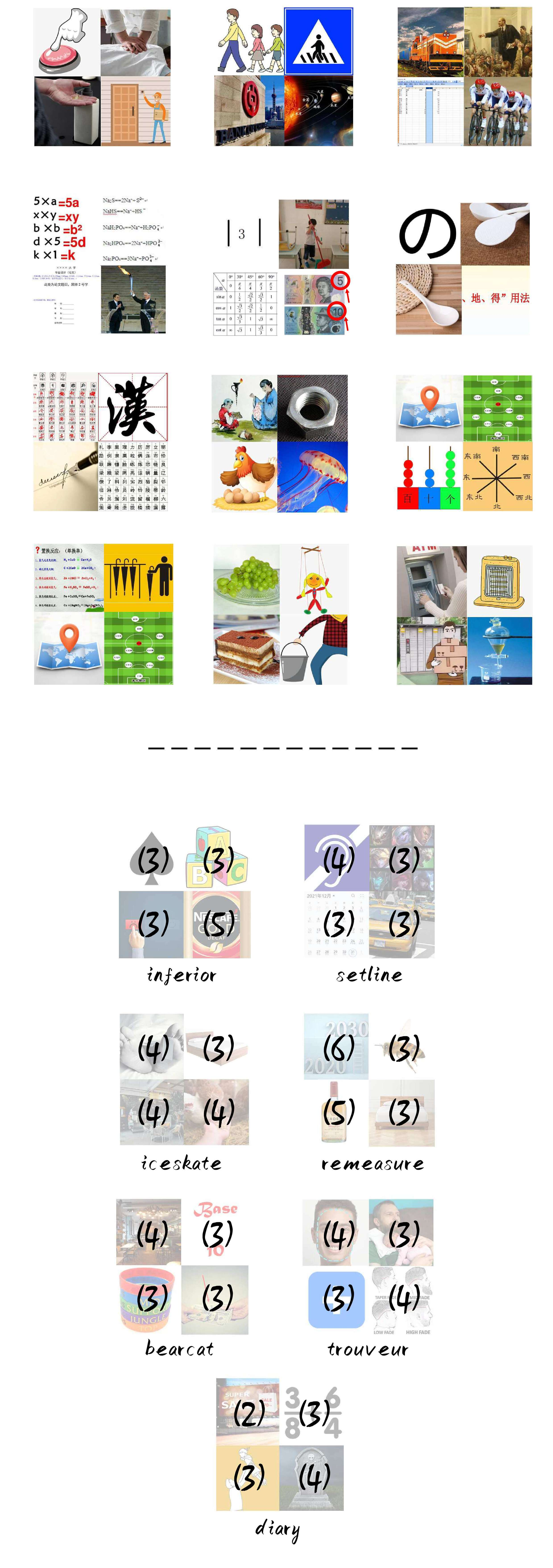 第一页是一个非常经典的游戏“四图猜一词”，four pictures one word，一组四张图都是对于同一个单词的描述，或者描述相关联的内容。不难看出，这里实际上是每张图都是某个字所组的词，具体如下：
